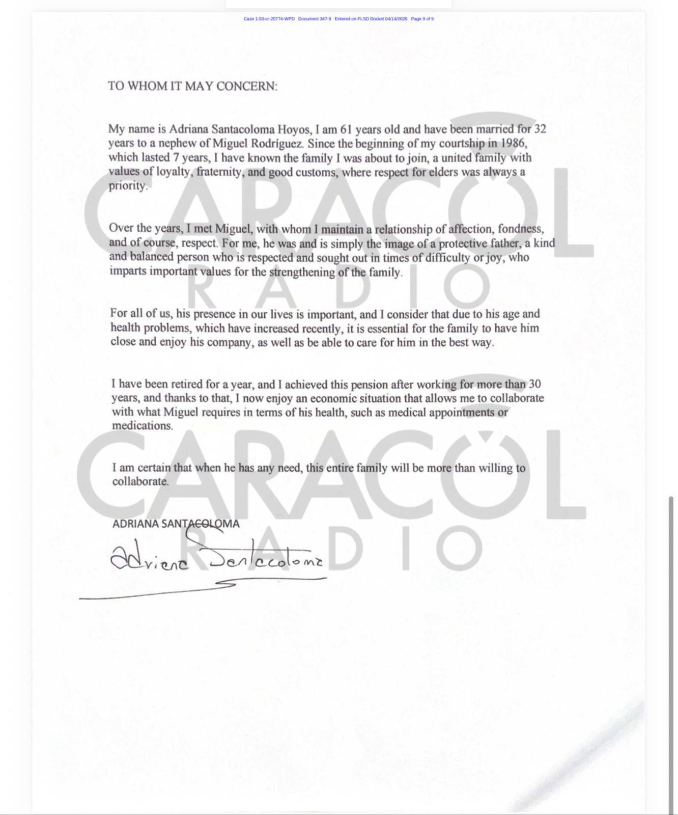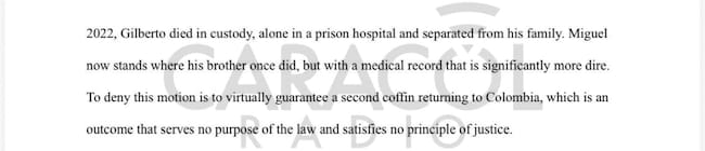 El documento también dice que su hermano Gilberto murió separado de su familia, porque estaba en plenas facultades mentales y las autoridades americanas decían que aún podía mandar a otras personas, pero que ese no es el caso de Miguel y afirma que mantener su encarcelamiento solo serviría para asegurar el envío de un segundo ataúd a Colombia.