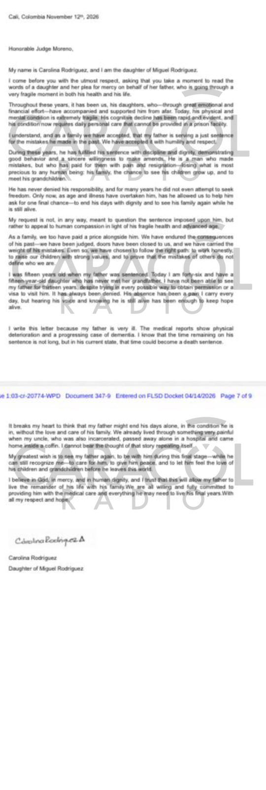 La segunda es de su hija Carolina que escribe al juez pidiendo compasión para su padre quien, según ella, reconoció sus errores y pagó por ellos.