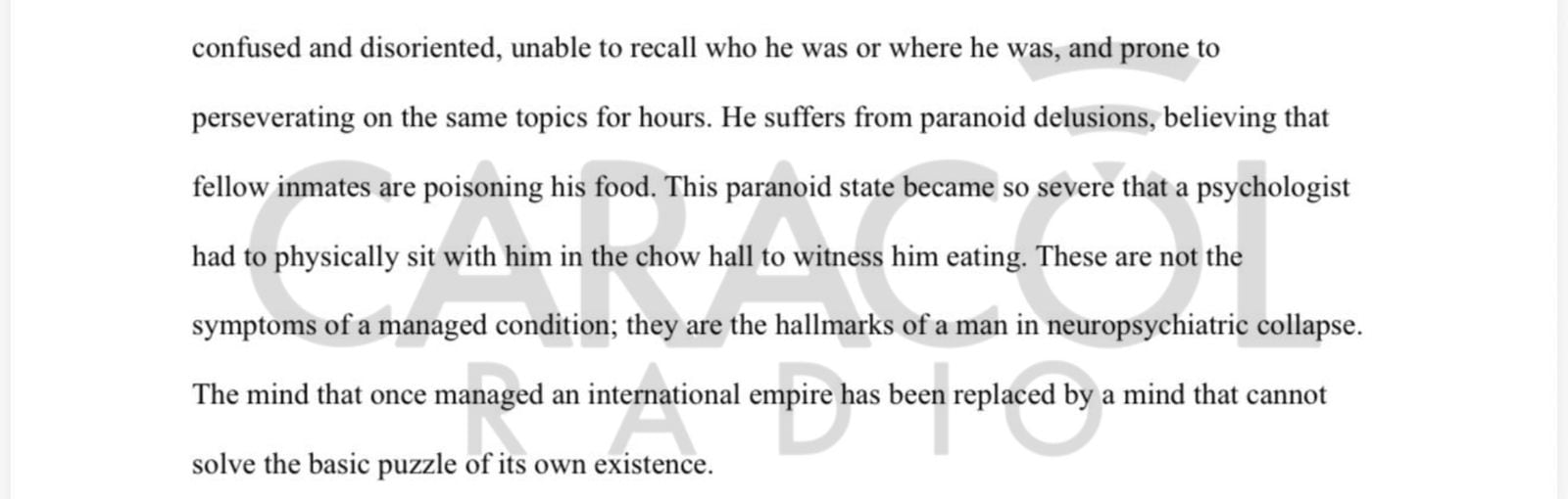 El documento también dice que su deterioro mental lo ha llevado a padecer delirios paranoicos que le hacen creer que sus compañeros de reclusión quieren envenenar su comida.