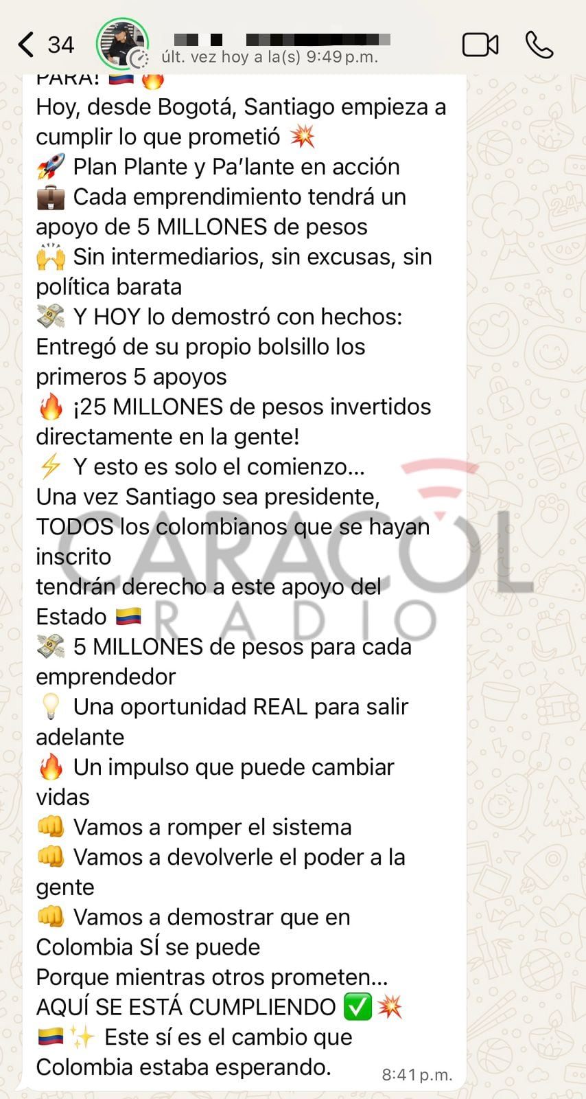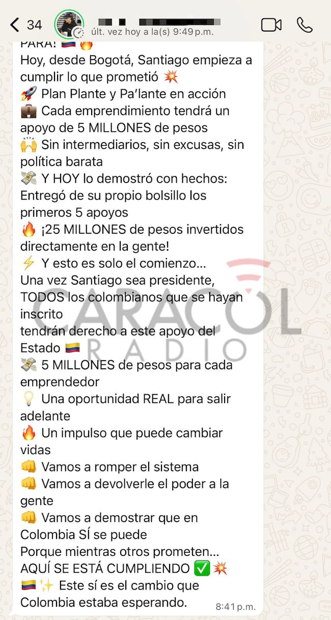 “Una vez Santiago sea presidente, todos los colombianos que se hayan inscrito tendrán derecho a este apoyo del Estado: $5 millones para cada emprendedor”, se lee en el mensaje de WhatsApp.