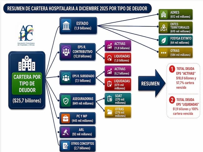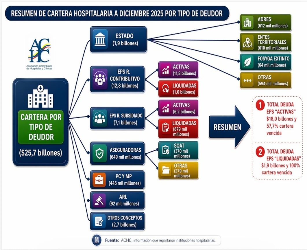 La crisis financiera del sistema de salud colombiano se profundiza. El más reciente estudio de cartera hospitalaria de la Asociación Colombiana de Hospitales y Clínicas (ACHC), con corte a diciembre de 2025, reveló que la deuda de EPS, el Estado y aseguradoras con hospitales y clínicas alcanzó los $25,7 billones, con un incremento del 7% frente a junio del mismo año.