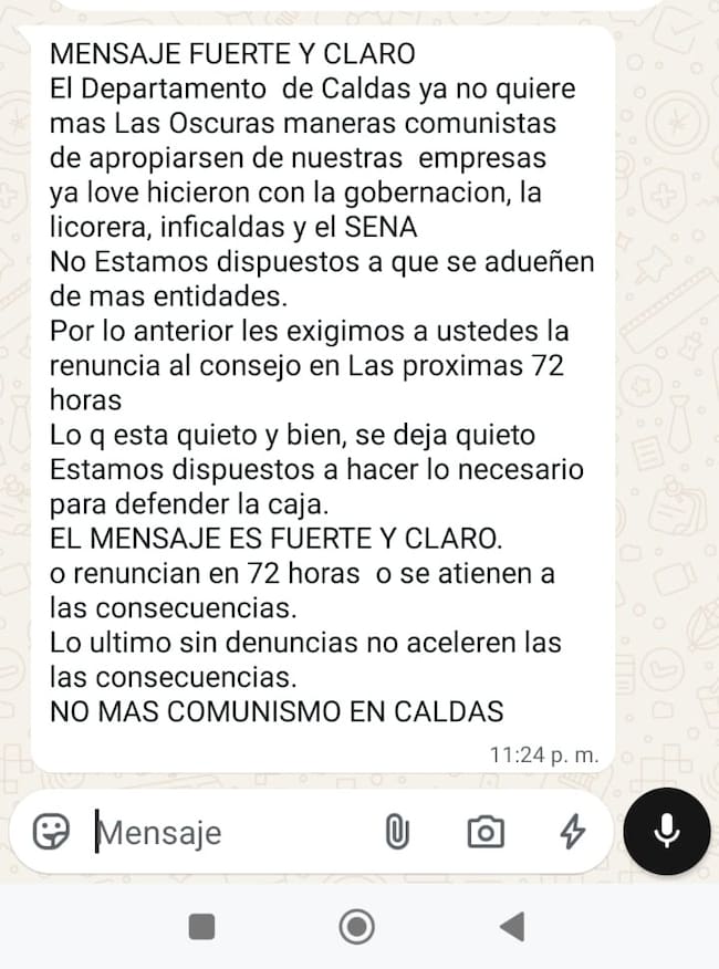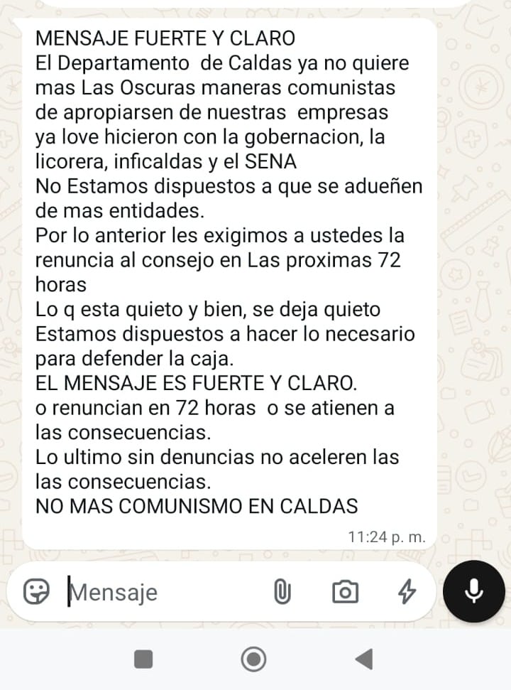 Esta persona, agrega que en las últimas horas han recibido dos amenazas vía WhatsApp: “... No estamos dispuestos a que se adueñen de más entidades. Por lo anterior, les exigimos a ustedes la renuncia al consejo en las próximas 72 horas. Lo que está quieto y bien, se deja quieto. El mensaje es fuerte y claro, renuncia en 72 horas o se atienen a las consecuencias…”.