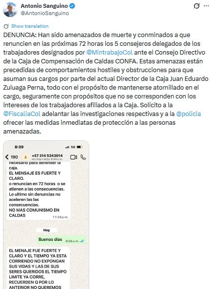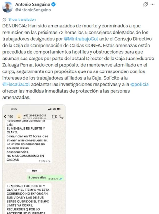 Igualmente, Ronald Bonilla, gobernador (E) de Caldas e integrante del consejo directivo, recibió mensajes intimidantes que buscan afectar su integridad y a su familia, por lo que la administración departamental rechaza cualquier tipo contrario a la ley.