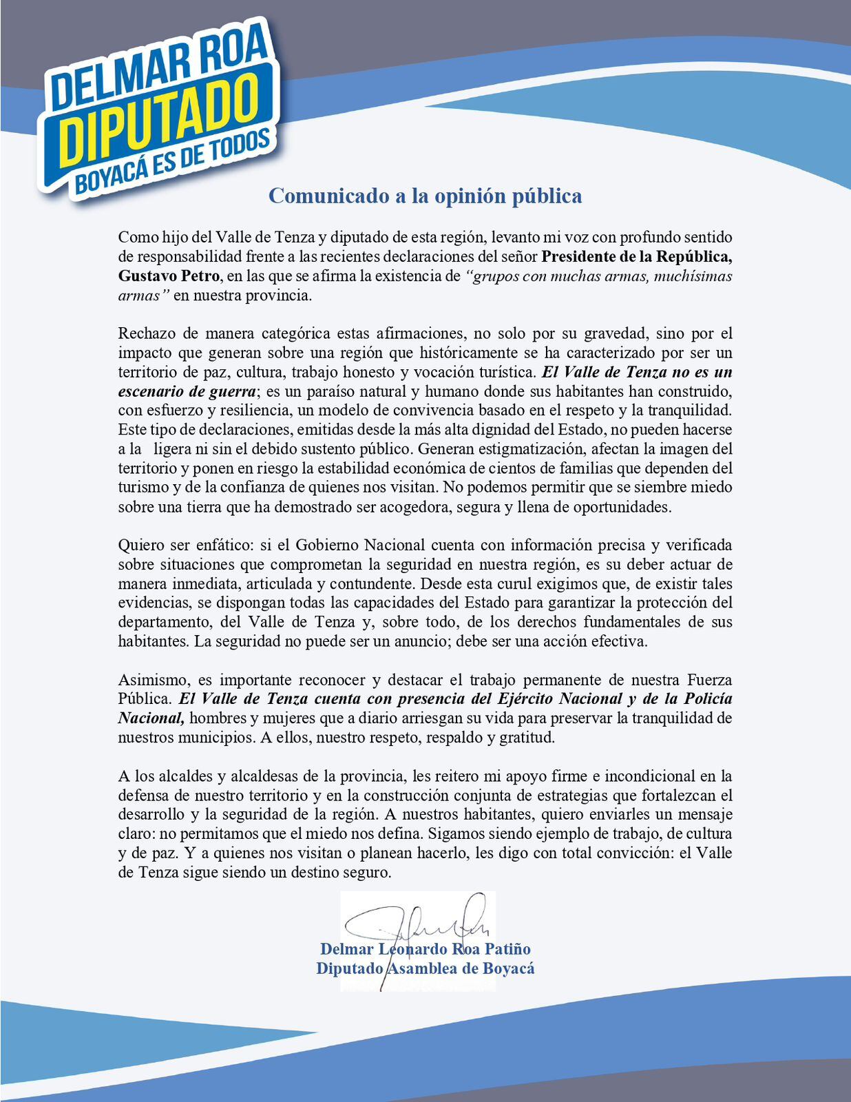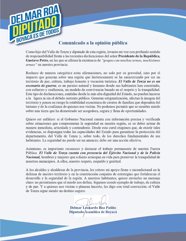 El diputado a la Asamblea de Boyacá, Delmar Leonardo Roa Patiño, rechazó públicamente las declaraciones del presidente Gustavo Petro, quien advirtió sobre la presunta presencia de «grupos con muchas armas» en el Valle de Tenza. A través de un comunicado dirigido a la opinión pública, el diputado calificó estas afirmaciones como graves y aseguró que afectan la percepción de una región que, según indicó, se ha caracterizado históricamente por su tranquilidad y vocación turística.