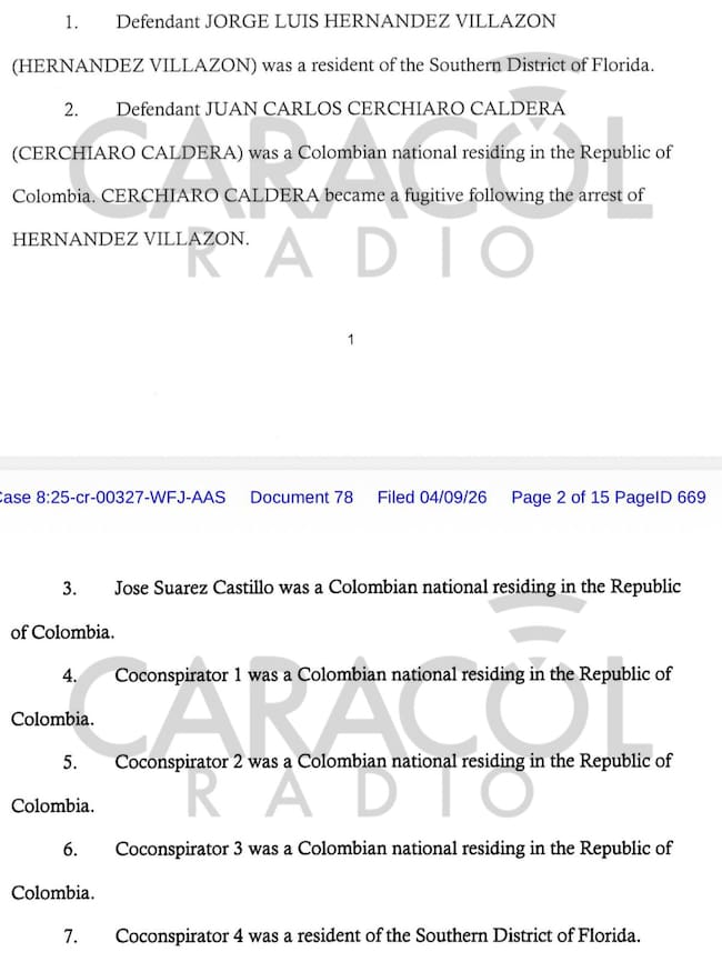 Hay siete conspiradores mencionados en el caso: El propio Hernández Villazón, un colombiano que se escapó después del arresto de ‘Boliche’, llamado Juan Carlos Cerchiaro Caldera, otro colombiano llamado José Suárez Castillo, el Co-Conspirator One, es decir, el abogado Daniel Peñarredonda, los coconspiradores dos y tres definidos como colombianos que hoy viven en Colombia; y el coconspirador 4, que es un residente en el sur de la Florida.