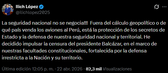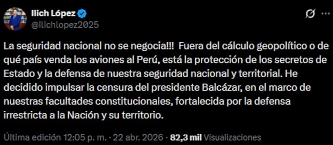 “La seguridad nacional no se negocia!!! (sic). Fuera del cálculo geopolítico o de qué país venda los aviones al Perú, está la protección de los secretos de Estado y la defensa de nuestra seguridad nacional y territorial”, aseguró López en su cuenta oficial de X (antes Twitter).