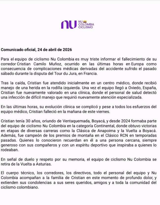 “Para el equipo de ciclismo Nu Colombia es muy triste informar el fallecimiento de su corredor Cristian Camilo Muñoz, ocurrido en las últimas horas en Europa como consecuencia de complicaciones médicas derivadas del accidente sufrido el pasado sábado durante la disputa del Tour du Jura, en Francia”.