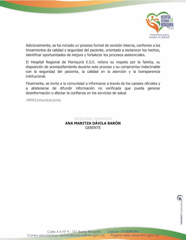 En respuesta a la denuncia, el Hospital Regional de Moniquirá emitió un comunicado en el que asegura que parte de la información difundida sobre el caso “carece de contexto clínico completo” y no refleja con precisión lo ocurrido. La institución sostiene que la situación fue identificada de manera oportuna por el equipo asistencial y que, desde ese momento, se activaron los protocolos de seguridad del paciente. Según el hospital, se garantizó valoración médica especializada, monitoreo permanente y las intervenciones necesarias conforme a la condición del recién nacido.