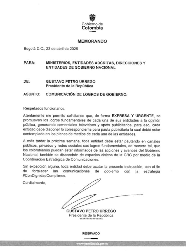 El memorando está firmado por el presidente Gustavo Petro, y tiene solicitud de forma EXPRESA Y URGENTE.