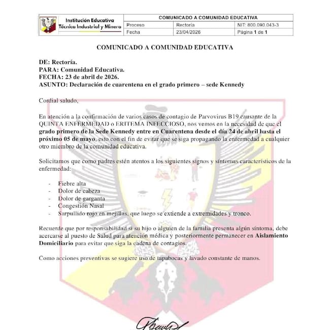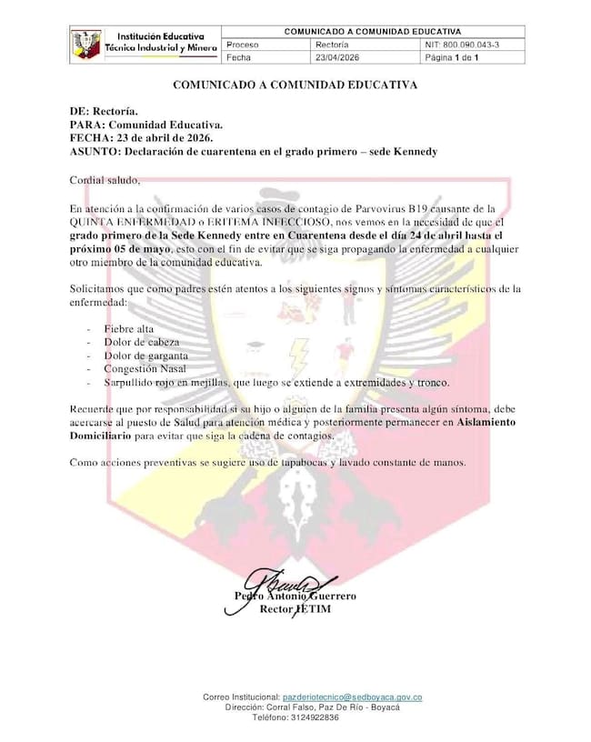 La Institución Educativa Técnica Industrial y Minera de Boyacá activó una cuarentena preventiva en el grado primero de la sede Kennedy tras la confirmación de casos de parvovirus B19, causante de la «quinta enfermedad» o eritema infeccioso. Según el comunicado del 23 de abril de 2026, la medida regirá del 24 de abril al 5 de mayo para evitar la propagación del virus.