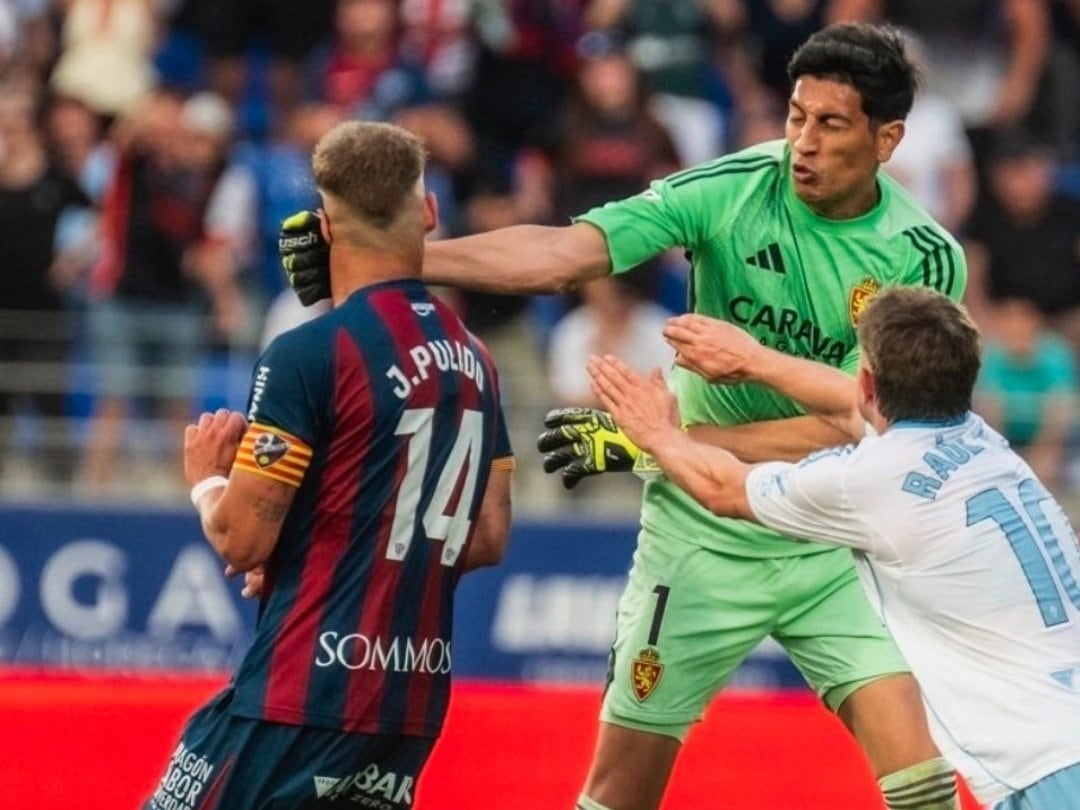 Con el marcador 1-0 a favor del Huesca y el reloj superando el minuto 95, el encuentro ya estaba cargado de tensión. En medio de una revisión arbitral y reclamos constantes, el capitán local, Jorge Pulido, se acercó al portero visitante, Esteban Andrada, en una acción que detonó el caos. El guardameta argentino, que ya tenía una amonestación, reaccionó empujando al defensor y provocando su caída. Esa acción le costó la segunda amarilla y, en consecuencia, la expulsión.