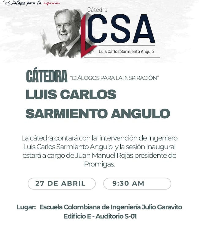 Este lunes 27 de abril, a las 9:30 de la mañana, el empresario Luis Carlos Sarmiento Angulo participará de la cátedra ‘Diálogos para la Inspiración’ en la Escuela Colombiana de Ingeniería Julio Garavito de Bogotá.