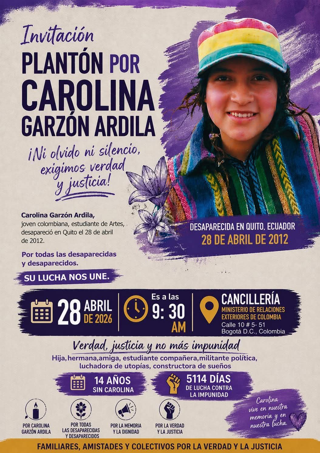 En esta ocasión, la protesta fue convocada para las 9:30 de la mañana con el propósito de exigir justicia por la desaparición de la estudiante y activista Carolina Garzón Ardila, quien desapareció en Quito, Ecuador, el 28 de abril de 2012.