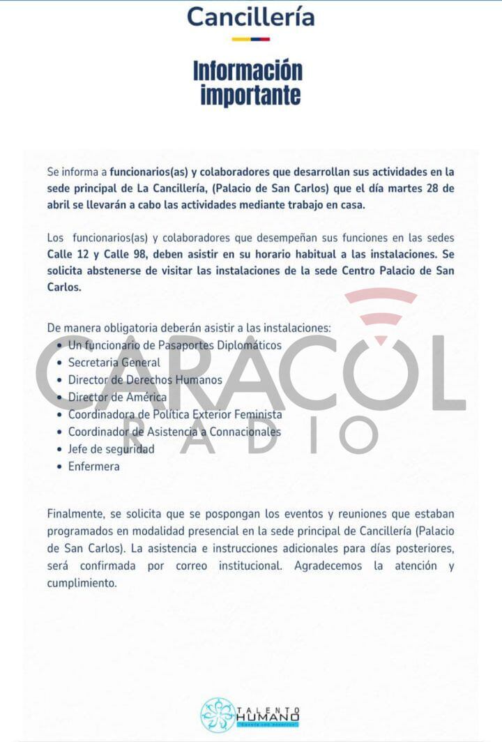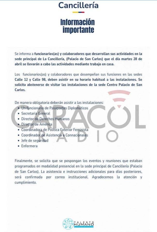 Caracol Radio conoció un comunicado emitido por la oficina de Talento Humano del Ministerio de Relaciones Exteriores en el cual se ha pedido a funcionarios y colaboradores que no asistan este martes 28 de abril al Palacio de San Carlos de Bogotá, su sede principal, ante la convocatoria de una nueva manifestación que se llevará a cabo frente a este edificio.