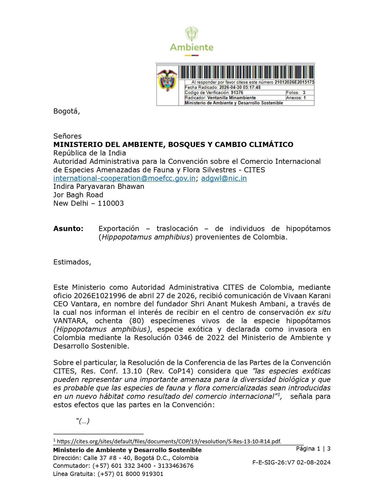 El Ministerio de Ambiente radicó una solicitud formal al Gobierno de India para conocer si es viable la autorización del ingreso de 80 hipopótamos desde Colombia al centro Vantara, asociado a la red de Reliance Industries.