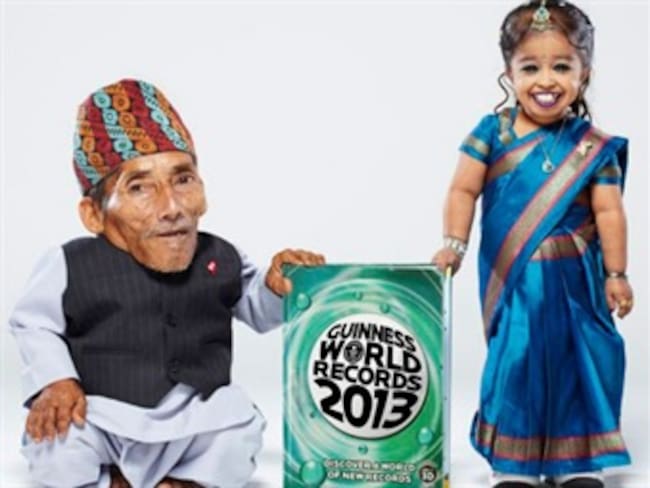 El nepalés Chandra Bahadur Dangi, de 72 años, y la india Jyoti Amge, de 18, se juntaron para la sesión de fotos de la edición 2013 del Libro de los Récords Guiness.