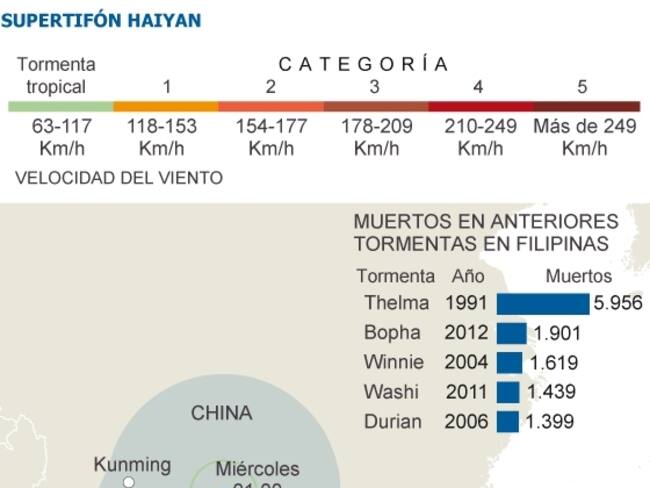 Un supertifón con vientos de más de 300 kilómetros por hora azotó el archipiélago y causó más de 10.000 muertos. Gráfico sobre el recorrido del tifón, realizado por El País, de España.