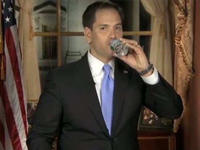 Durante su discurso, el hispano no pudo aguantar más y se agachó a alcanzar una botella de agua. Apenas fueron unos segundos e intentó hacerlo sin dejar de mirar a cámara.