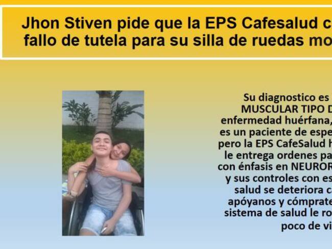 Pedro Gil Henao tiene una parálisis cerebral y desde el mes de febrero no recibe ni medicamentos ni atención de Cafesalud. El hombre se encuentra ya con desnutrición avanzada.