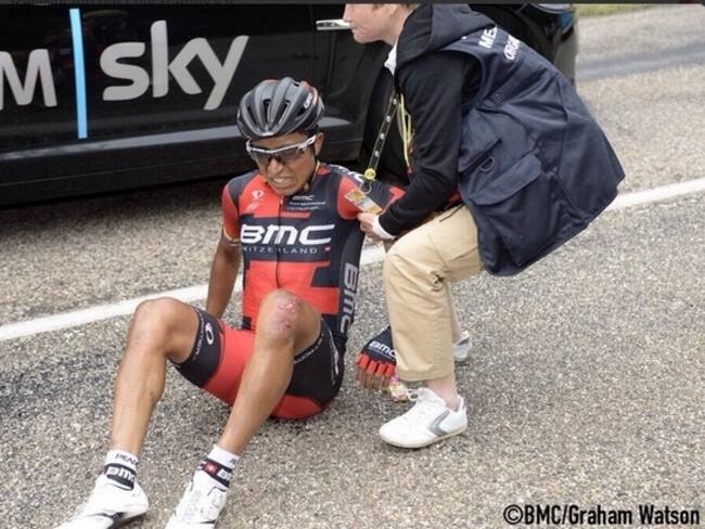 El ciclista colombiano del BMC sufrió una caída sobre el final de la séptima etapa y tuvo que abandonar la carrera. Foto @BMCProTeam