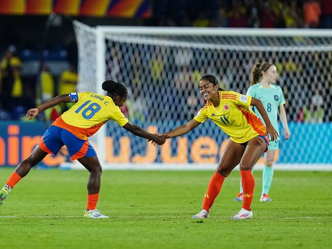 AME5545. BOGOTÁ (COLOMBIA), 03/09/2024.- Jugadoras de Colombia celebran un gol este martes, en un partido del grupo A de la Copa Mundial Femenina sub-20 entre las selecciones de Colombia y Camerún en el estadio de El Campín en Bogotá (Colombia). EFE/ Carlos Ortega