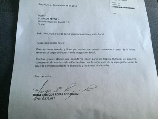 Por medio de una carta dirigida al alcalde de Bogotá, Gustavo Petro, Jorge Rojas, renunció a su cargo como secretario de integración social.