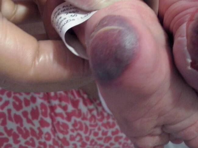 "La niña estaba llorando; llore y llore; entonces mi señora la empezó a mirar y vio que las medias estaban goteando sangre. Entones ella (la mamá), angustiada, llamó a las enfermeras a ver qué pasaba… las enfermeras en el momento que le quitaron las medias se trajo la piel, y le dijeron a la mamá que eso no fue nada grave, que eso fue que la habían tallado con el alcohol, que no se preocupara, que la niña estaba bien", relató el padre, también angustiado.