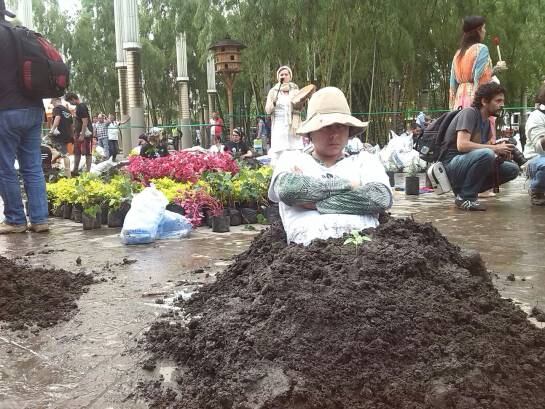 Mauricio Cortés, vistió una camisa de alambre de púas, mientras permanecía inmóvil del torso hacia abajo, bajo tierra. Su mensaje: la no repetición.