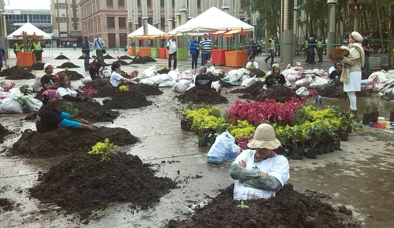 El homenaje, ‘Soy Memoria y Resistencia’, se caracterizó por una muestra simbólica en la cual, unas 40 personas se enterraron a medio cuerpo bajo pequeñas montañas de tierra, y con fotografías de sus familiares, recordaron la época de violencia, en el parque de La Luz, en el centro de Medellín.