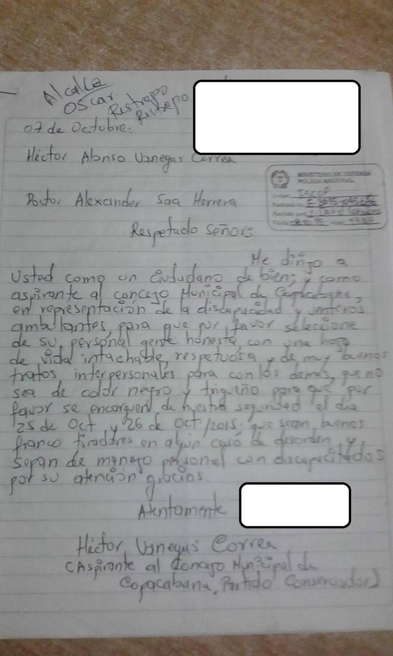 Héctor Vanegas Correa, aspirante al concejo de Copacabana por el Partido Conservador, le solicitó al teniente Alexander Sea, comandante de la inspección de policía de este municipio, una escolta que no sea ni negro ni trigueño, honesto y con una hoja de vida intachable para su seguridad en las elecciones de este 25 de octubre.
