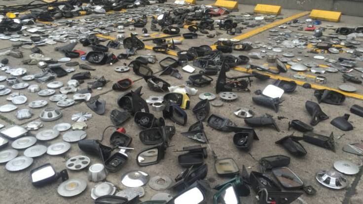 El oficial agregó que en la diligencia fueron encontrados más de 800 espejos de automóviles de todas las marcas, 150 lunas, 500 boceles y 100 emblemas de reconocidas marcas, esto en el mercado legal y como nuevo podría tener un valor de 160 millones de pesos.