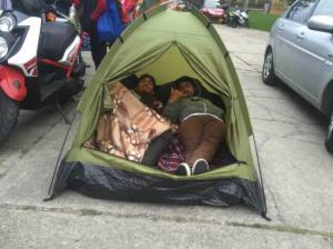 Desde la tarde del lunes hinchas de independiente Santa Fe llegaron al Coliseo El Campin para hacer fila y obtener la boleta para la final de la copa suramericana; con carpas, cobijas y tinto o cerveza en mano los seguidores del equipo cardenal esperan con ansias el partido.