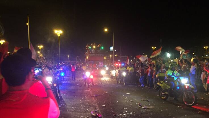 Ocho horas después del triunfo de Santa Fe en la Sudamericana los hinchas del equipo cardenal continúan celebrando la primera copa que recibe Colombia en este campeonato.