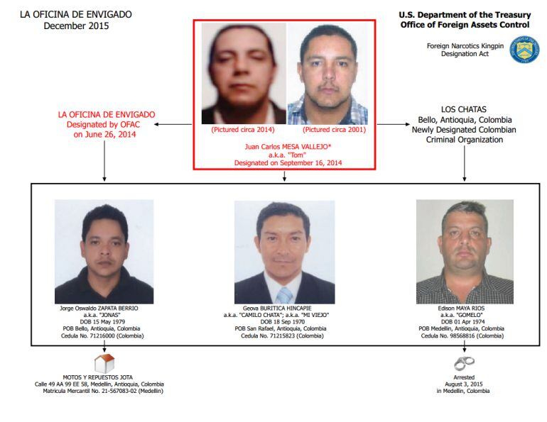 Según detalla el documento, “Los Chatas”, son sancionados por su relación con “La Oficina” de Envigado, además de participar en temas de narcotráfico y violencia.