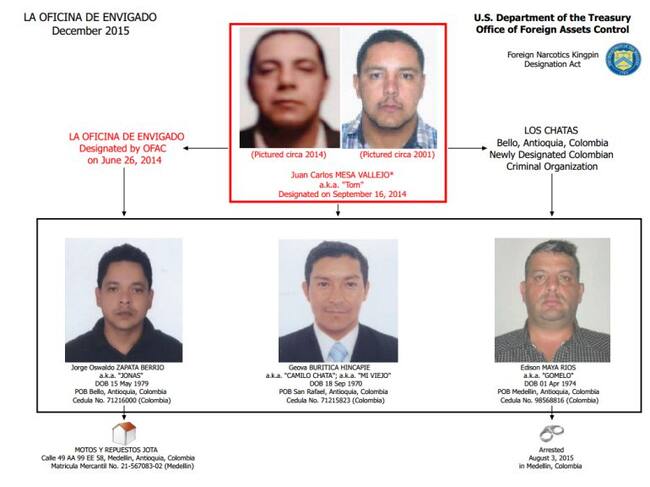 Con respecto a “Los Chatas”, John E. Smith, Director Interino de la Oficina del Tesoro para el Control de Bienes Extranjeros, manifestó que “el poderoso subgrupo Los Chatas está involucrado en el narcotráfico y una serie de crímenes violentos como extorsión, asesinato y robo en nombre de La Oficina de Envigado”.