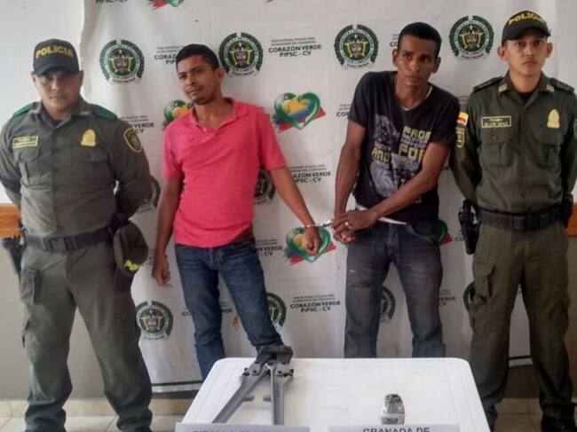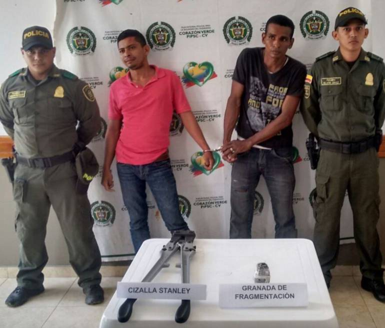 En el procedimiento de registro, se les halló en su poder una cizalla y una granada de fragmentación IM-26 que portaban al interior de un costal. Los detenidos fueron identificados como Frank José Rodríguez Narváez, de 28 años y oriundo de Bosconia, Cesar; y Jairo Manuel Alfaro Cadena, de 35 años edad, oriundo de San Pedro, Sucre.