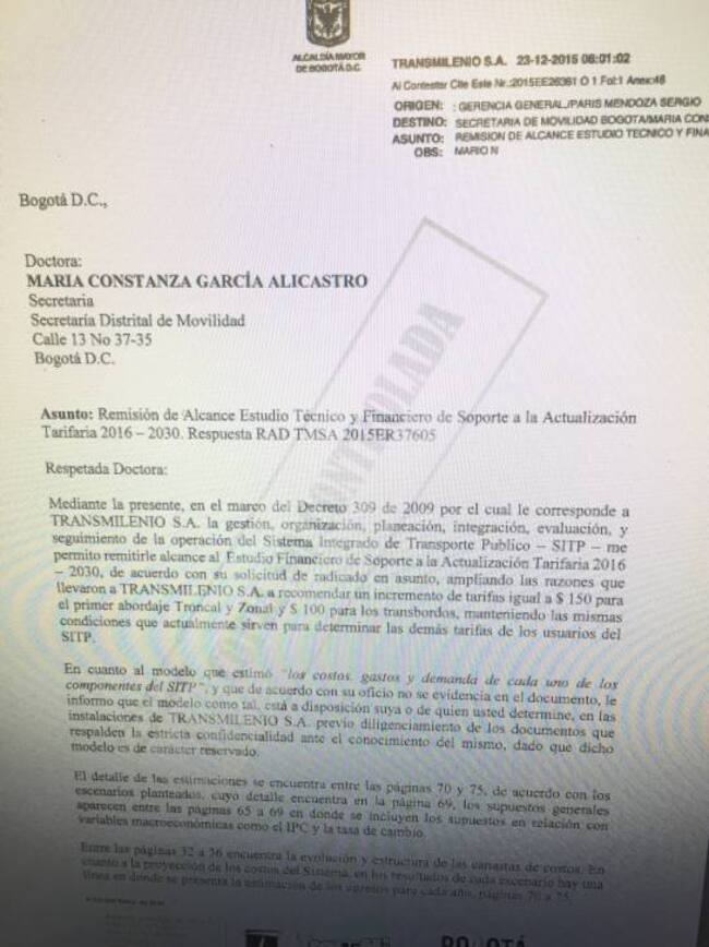 Caracol Radio tiene en su poder un carta fechada el 23 de diciembre de 2015, donde el gerente de Transmilenio de la época, Sergio Paris, le hacía entrega del estudio técnico y financiero de soporte a la actualización tarifaría para el 2016, a la secretaría de movilidad de la administración Petro, María Constanza García.