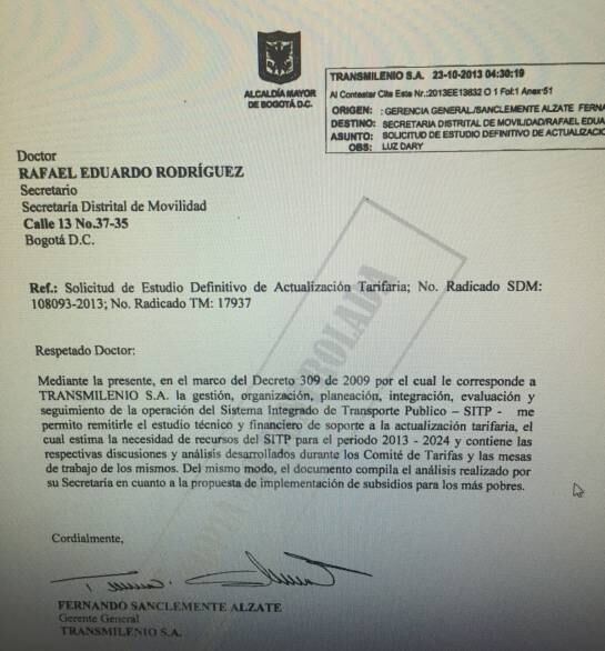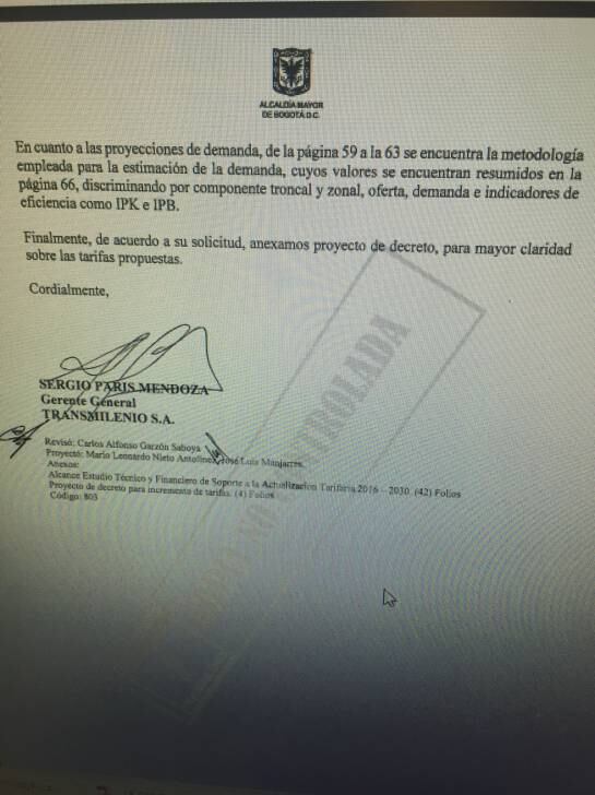 Caracol Radio tiene en su poder un carta fechada el 23 de diciembre de 2015, donde el gerente de Transmilenio de la época, Sergio Paris, le hacía entrega del estudio técnico y financiero de soporte a la actualización tarifaría para el 2016, a la secretaría de movilidad de la administración Petro, María Constanza García.