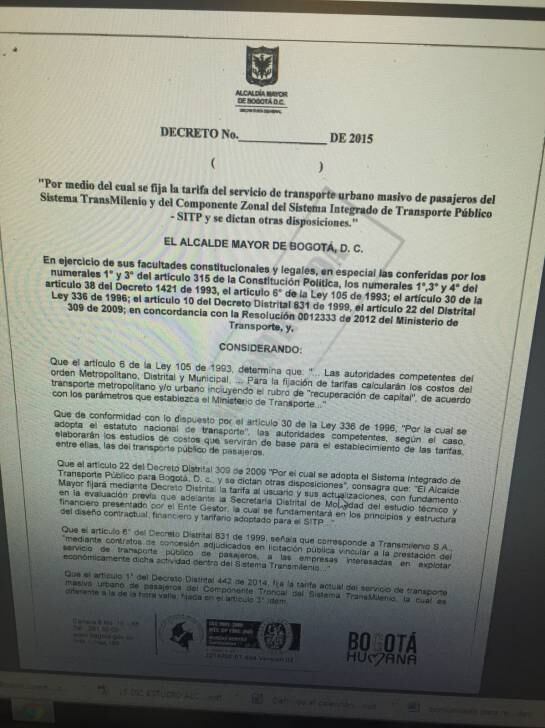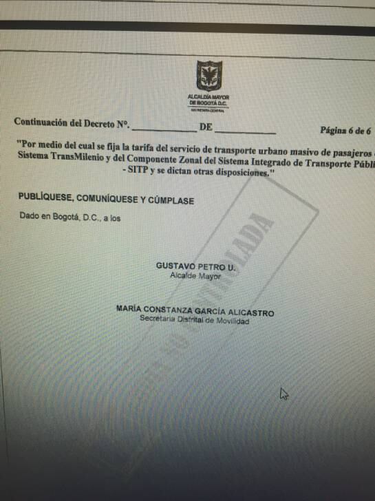 Incluso, también tenemos en nuestro poder, el decreto elaborados para el incremento de las tarifas, pero sin número, sin fecha, y sin la firma de Gustavo Petro y María Constanza García.