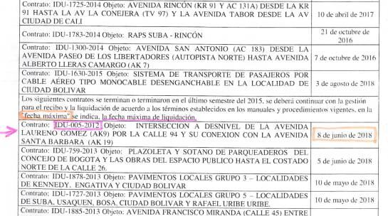 El plazo, que el Distrito habría fijado al contratista, aparece en el informe de empalme que entregó el IDU, durante el gobierno Petro, a la administración del alcalde de Bogotá Enrique Peñalosa, y que en días pasados anunció como fecha límite diciembre de 2016 para la entrega del paso deprimido en la calle 94.