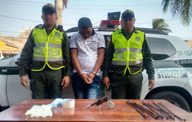 Al particular se le encontró un arma de fuego tipo artesanal y un cartucho para la misma, unos guantes de lates, tapabocas, cinta aislante y manillas de seguridad plástica elementos que serían utilizados por el presunto delincuente, para amordazar a las personas que se encontraban hospedada en el hotel.