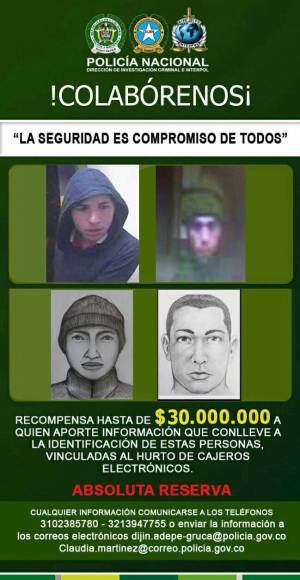 "Ya tenemos retratos hablados y fotografías de estos hombres que ya han robado $160 millones en cajeros de siete municipios del departamento, por ellos estamos ofreciendo hasta $30 millones", manifestó el comandante de la Policía de Cundinamarca, coronel Miguel Correa.