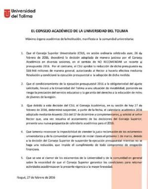 El gobernador del Tolima y presidente del Consejo Superior, Oscar Barreto, afirmaron que no habrá autorización para dicho empréstito y reiteró que “la Universidad está en manos de la politiquería y el clientelismo”.