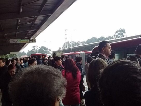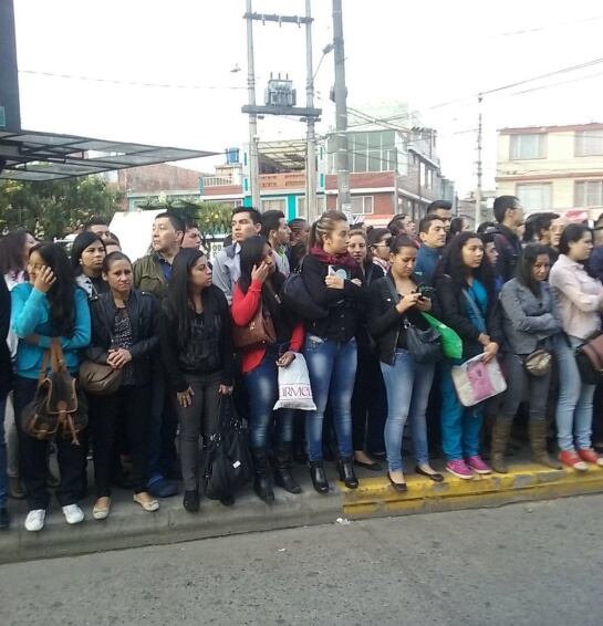 Protestando por la demora de rutas, como viene ocurriendo en los últimos días, usuarios de Transmilenio bloquean a esta hora la calzada exclusiva y la entrada al Portal Sur del sistema de transporte masivo.