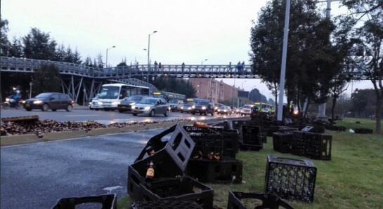 Enorme trancón en Autopista Norte por accidente de camión que transportaba cerveza