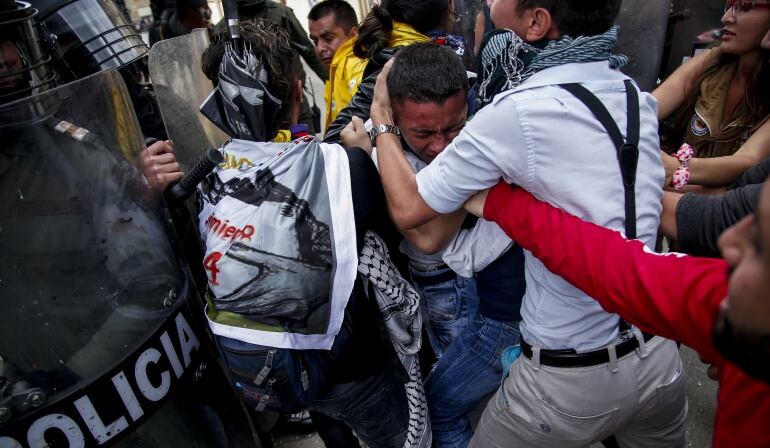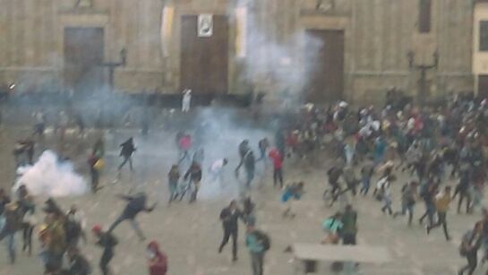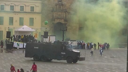 Fuertes enfrentamientos se presentaron en la Plaza de Bolívar entre un grupo de encapuchados y el ESMAD, luego de que fueran arrojados varios objetos contundentes contra los uniformados que custodiaban las marchas en desarrollo del paro nacional.