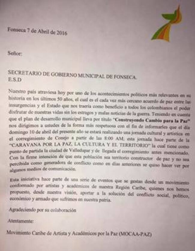 Según manifiestan en una carta enviada al alcalde de Fonseca, solicitando permiso, la caravana denominada “Conejo Por la Paz, la Cultura y el Desarrollo”, tiene como propósito “resarcir el daño que le hicieron los medios a los habitantes de Conejo” por considerar que fueron estigmatizados como amigos de la guerrilla, y allí realizarán supuestos eventos culturales.