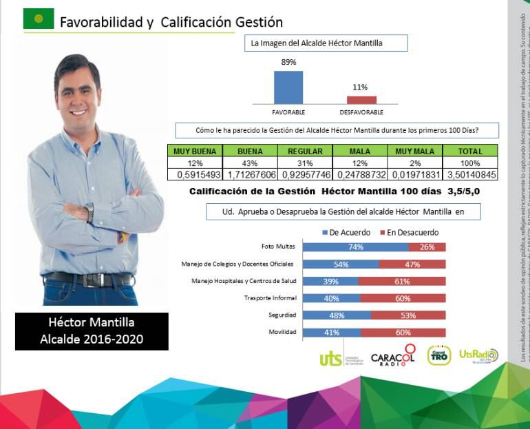 Los encuestados por las UTS calificaron con un 3.5 al alcalde de este municipio, Héctor Guillermo Mantilla quien aparece además como una imagen favorable del 89%