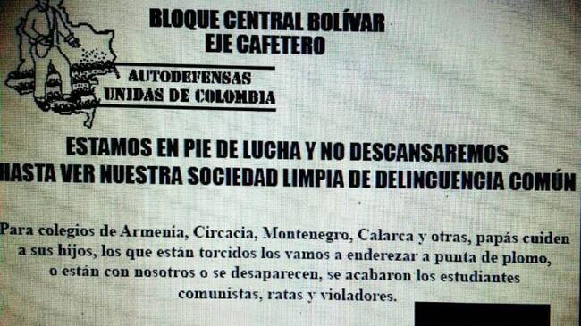 El sub comandante de la policía en este departamento, coronel Fabián Ospina dijo que luego de que se emitiera un volante que amenaza a los estudiantes comunistas, a los violadores y delincuentes de Armenia, Calarcá, Montenegro y Circasia firmado por las Autodefensas Unidas de Colombia se están haciendo las indagaciones del caso para determinar quiénes estaría detrás de esta situación, pues es claro que en el país desde hace mucho rato no existen las AUC.