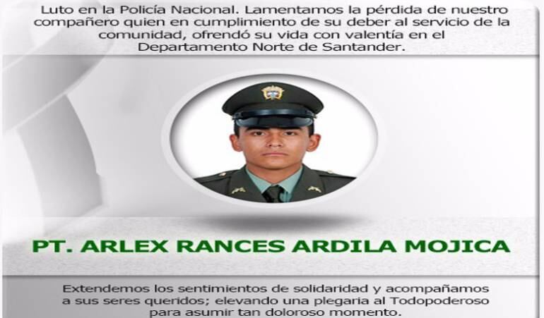 El uniformado falleció en la mañana de este domingo cuando policías se enfrentaron a dos sicarios de la banda ‘Los Pelusos’, del EPL que repartían volantes donde extorsionaban a los comerciantes de Ábrego, Norte de Santander.